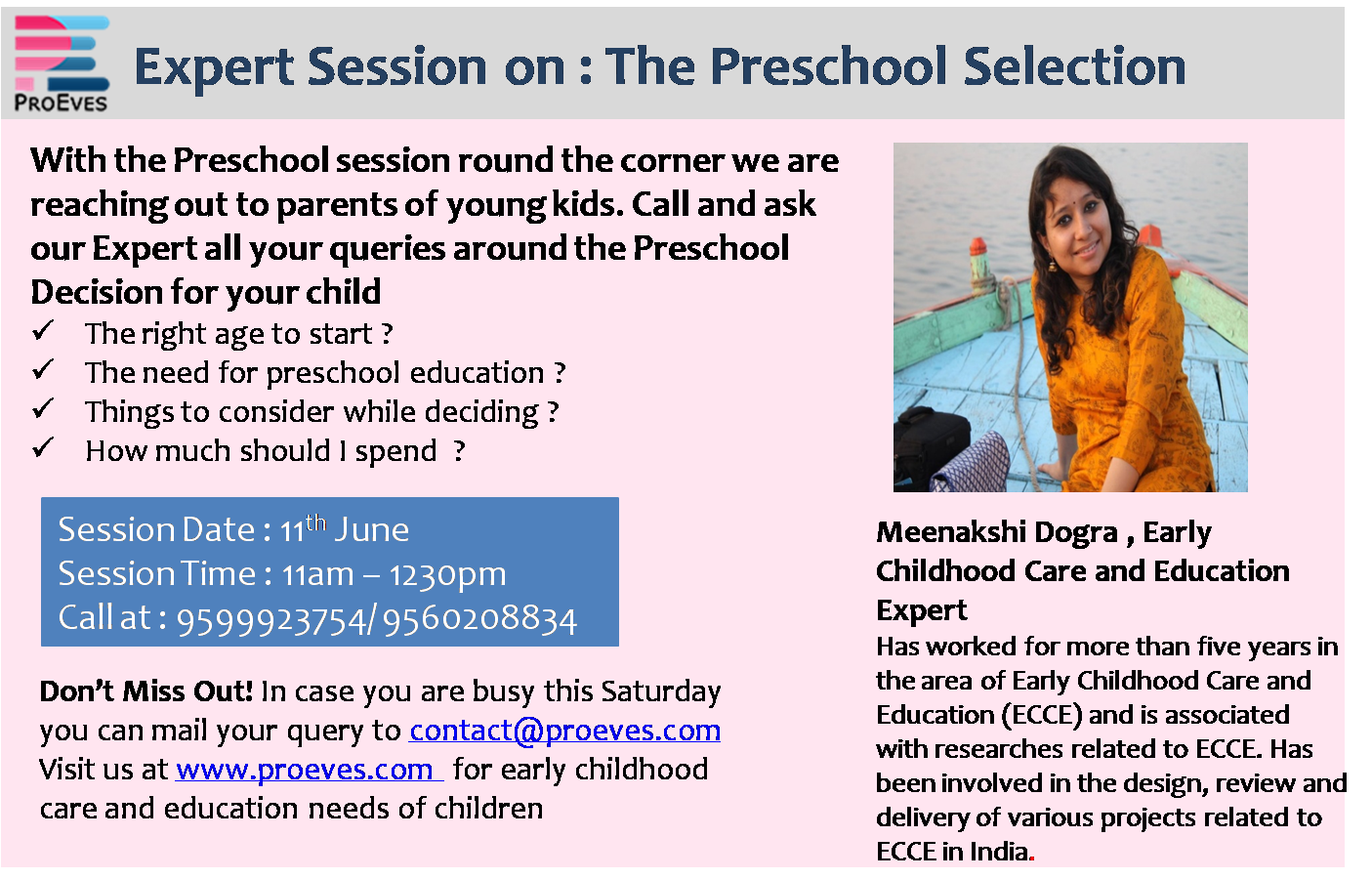 Are you a mother of a young kid and thinking about PreSchool Education having many questions in mind? Well, you are at the right place. We are coming with a special session on ‘The Preschool Selection’. With the Preschool session round the corner this session will be useful for you. Call and ask our Expert; all your queries around the Preschool Decision for your child