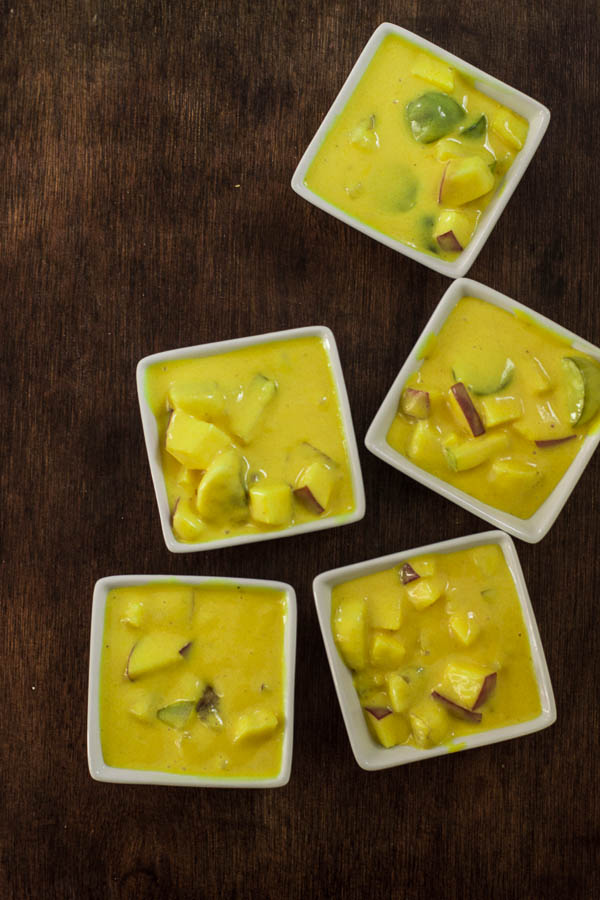 Our version has mango pulp, melted vanilla ice cream and seasonal fruits. We used apples, seedless grapes,persimmons, pears, bananas and pineapple. I added cardamom powder which is purely options. If you wish, you can buy canned fruits and add them too. Do note that mango pulp in tins sold at super market is sweetened with sugar and the vanilla ice cream has sugar too. So I will prefer to use natural fruits to balance out the sweetness. If you choose to use canned fruits, rinse them well to get rid of any syrups. You can also create mango pulp from fresh mangoes from the season and accordingly sweeten it.